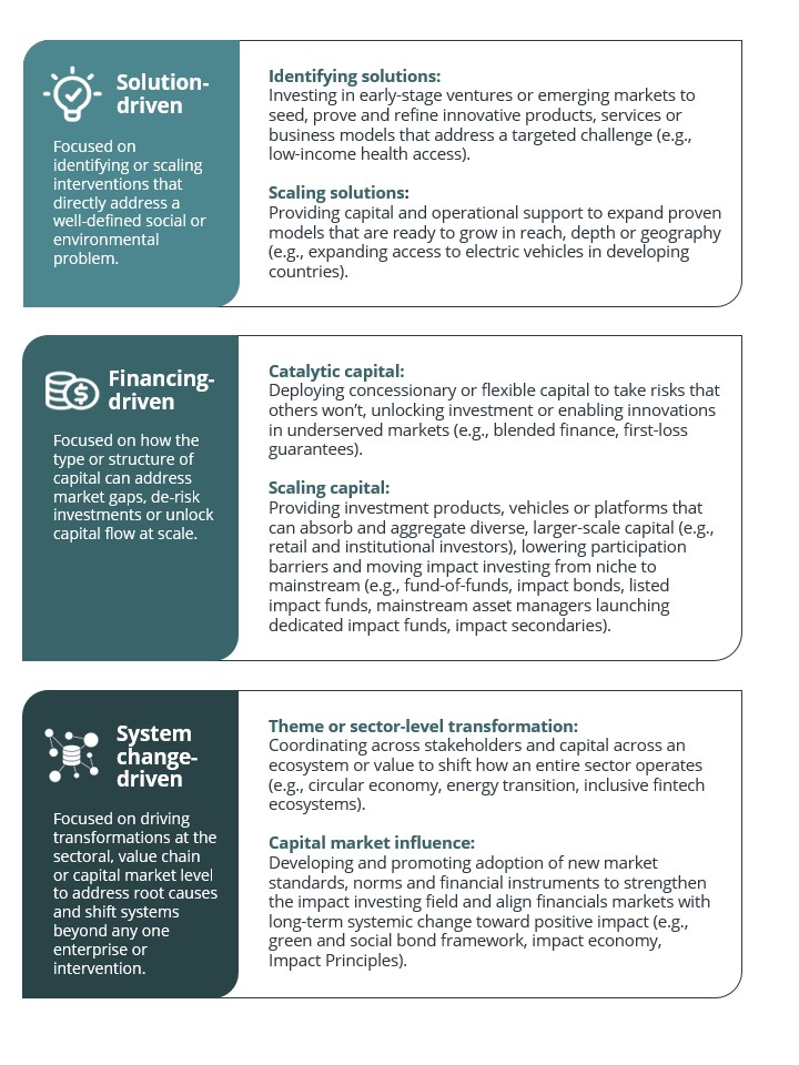4. Strategic orientation archetypes. As more investors articulate their theories of change across diverse markets, sectors and asset classes, a set of archetypes are emerging that reflect distinct approaches to impact ambition and value creation. These archetypes may be grouped into three broad categories: