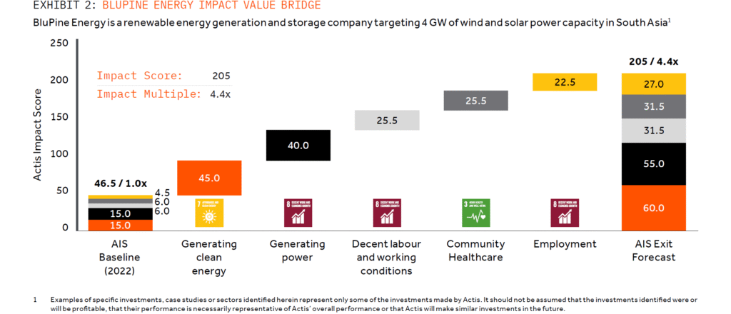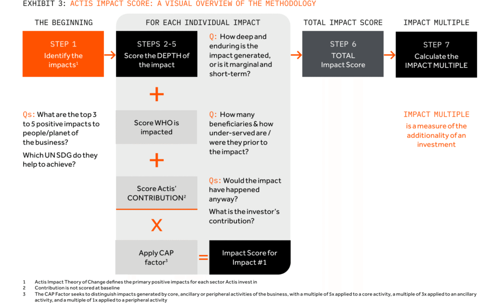 - The Actis Impact Score (IAS): The AIS estimates the projected impact outcomes of a prospective investment and reflects a transaction-specific impact thesis. These forecast scores are jointly developed by the investment and sustainability teams ahead of Final Investment Committee approval to define the intended impact of the proposed investment the beneficiaries, and the magnitude of impact targeted. Prior to deal completion, investments receive a forecast AIS score, translating an investment’s impact thesis into quantified projections and visually mapping expected outcomes through an Impact Value Bridge. [See practice examples 4.1 and 4.2.]