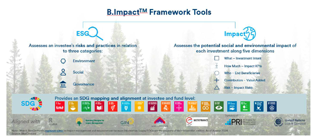 BlueOrchard, a member of the Schroders Group, manages the largest microfinance fund globally and serves as a trusted partner to leading development finance institutions through its expertise in blended finance mandates. It conducts ex-ante impact assessment through its proprietary B.Impact Framework, which applies standardized sustainability and impact scorecards and ratings across impact themes and asset classes (private debt, private equity and listed debt). [See Practice Examples 4.3.]
