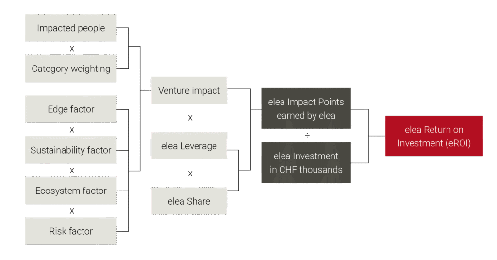 - Incorporating investor contribution through elea Share and elea Leverage: elea then reflects its monetary and non-monetary contributions into the final score through the elea Share, its portion of the total funding, and the elea Leverage, the extent of its non-financial contribution. The product of venture impact with these figures yields elea Impact Points, an artificial currency that allows elea to compare impact potential on a standardized, consistent basis.