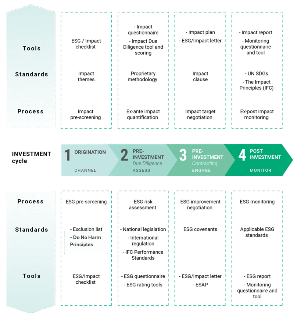 - Full due diligence: Assessing expected impact in depth, using a combination of internal and external tools such as impact due diligence checklists or questionnaires, investment-level theories of change and dedicated impact narratives in investment memos.