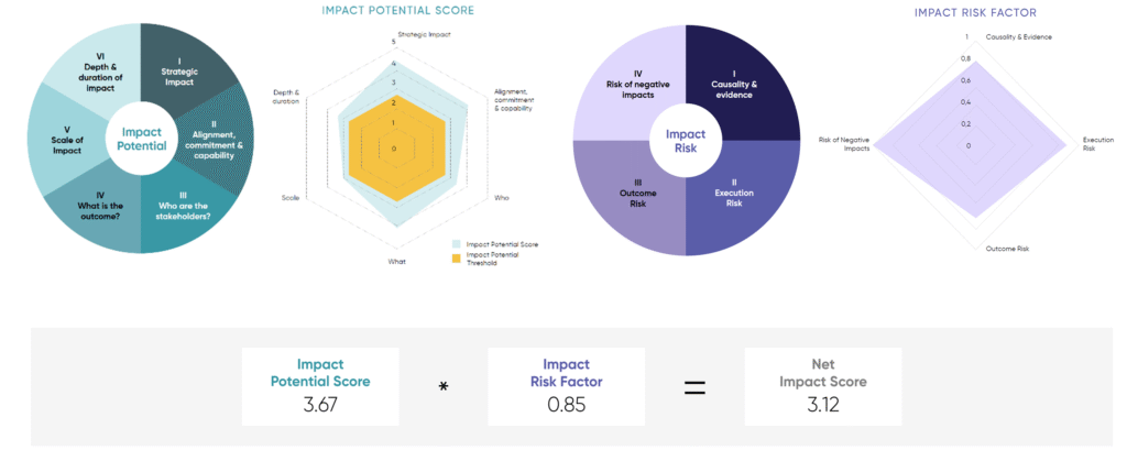 - Impact Framework – a standardized impact management framework: As part of the framework, each prospective investment undergoes a structured Impact Scorecard assessment prior to selection and must meet a defined minimum impact score and be approved by the impact management team to be eligible for portfolio inclusion. [See Practice Examples 4.4.]