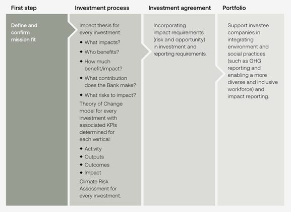 - Multi-level KPIs with baseline driven by theory of change: For each investment, the Bank co-creates an investment-level theory of change with the investee, capturing expected activities, outputs, outcomes, and mission impact. The theory of change establishes mutually agreed impact KPIs that reflect the investment’s specific pathway to impact. Impact KPIs are applied at the investment, mission and portfolio levels, with baselines established at the point of investment, providing a foundation for ongoing monitoring. [See Practice Example 4.9.]