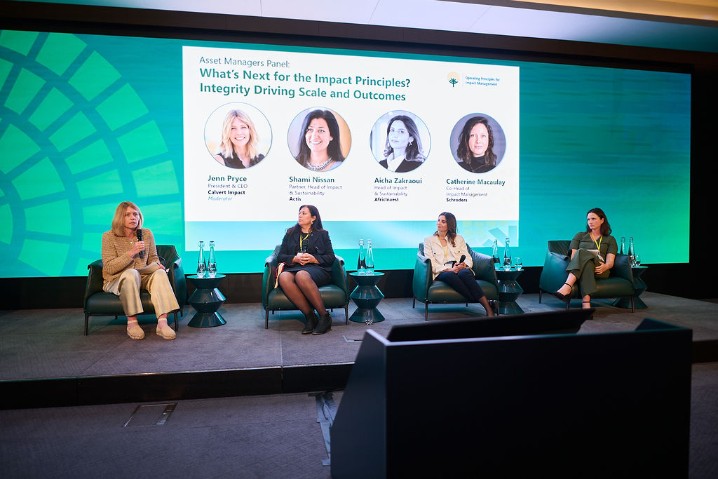 An asset owner and allocator panel, featuring Claudia Kruse (APG), Andrew Lee (UBS Global Wealth Management), and Danielle Brassel (Zurich Insurance Company) and moderated by Christian Rosenholm (GIIN), highlighted the pivotal role that the Impact Principles play in enabling investors’ confidence in selecting asset managers with consistent rigor, transparency, and impact integrity. For our asset manager panel, Jennifer Pryce (Calvert Impact) moderated a discussion with a diverse group of asset manager Signatories about how the Impact Principles can further drive the scaling of the market and ultimately the achievement of impact outcomes, featuring Shami Nissan (Actis), Aicha Zakraoui (AfricInvest), and Catherine Macaulay (Schroders).